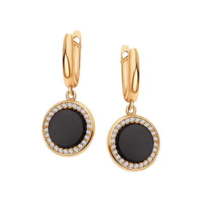 Kolczyki wykonane ze złota próby 0,333. Model ozdobiono onyksem i cyrkoniami. Masa 3.40 g