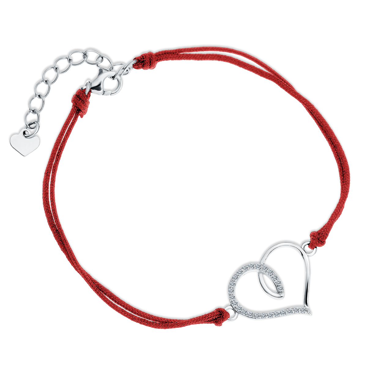 Srebrna bransoletka z podwójnym czerwonym sznurkiem – serce z cyrkoniami