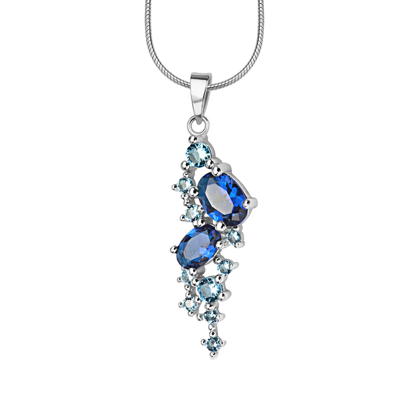 Zawieszka wykonana ze srebra próby 0,925. Model ozdobiono niebieskimi cyrkoniami. Wysokość 30 mm. Masa poniżej 5 g.